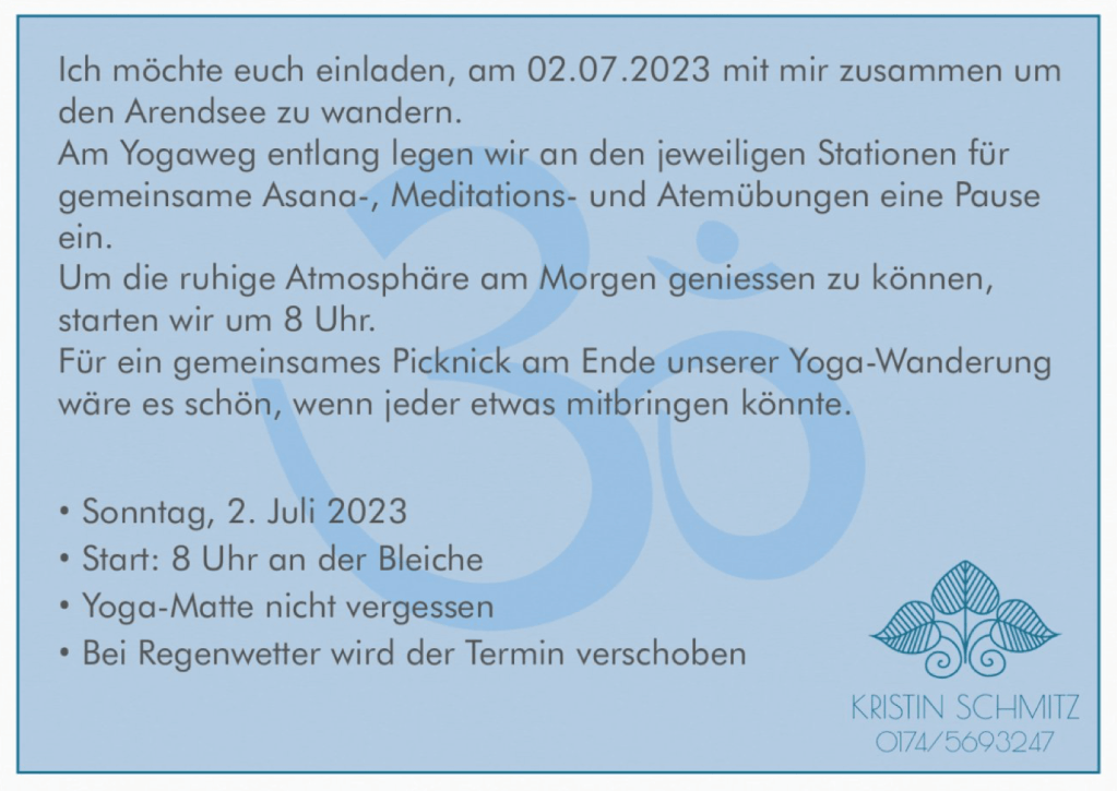 - Yoga-Wandern-Picknick, eine achtsame Wanderung um den Arendsee, Samstag 11.05.2024